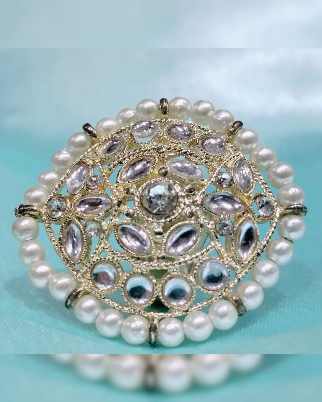 This exquisite ring showcases intricate gold-toned craftsmanship, embellished with shimmering Kundan stones and encircled by elegant white pearls. Its adjustable design offers comfort and style, making it a perfect choice for weddings, parties, and festive occasions.